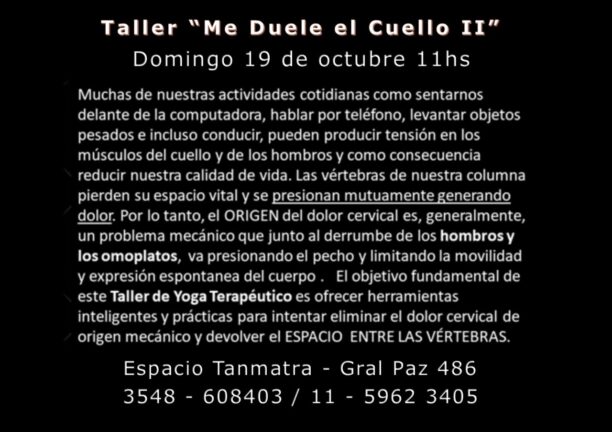 El Taller de Cervicales aborda esta problemática de manera teórica (con videos explicativos de la estructura cervical, tanto a nivel de las vértebras como de los músculos implicados) para poder comprender cabalmente la complejidad que somos; y de manera práctica, con ejercicios posturales, de fortalecimiento, movilidad y elongación, para poder ir devolviéndole al cuello los grados adecuados de tono y elasticidad.